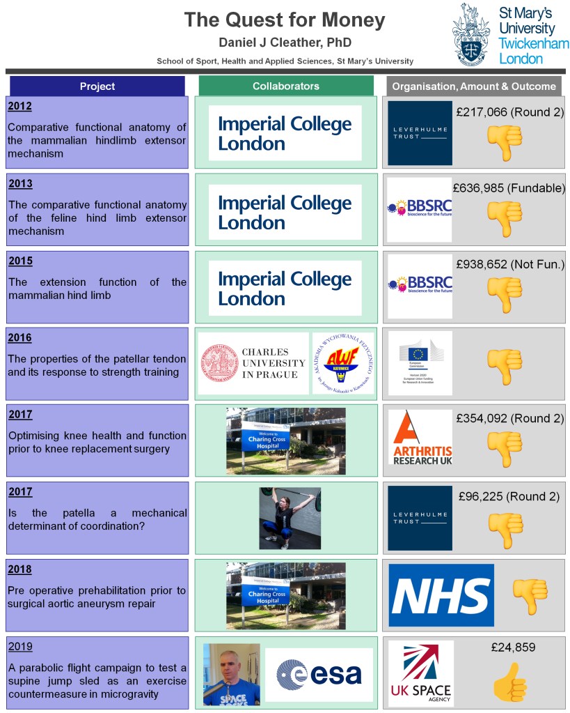 Applying for grants is even worse. The process is highly competitive, and so a lot of good proposals don’t get funded. The image here is a summary of my own grant applications over the last 10 years. Weeks of work went into each of these failed applications. It is a story with a happy ending, but this is only because of a recent success.