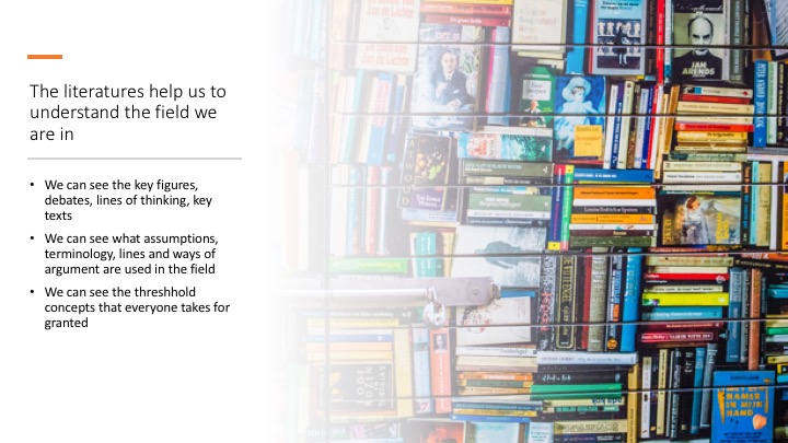 Use the literatures to help you construct a written description of your field, or of your multiple fields. Describe which group of authors and texts you want to align with and why. Your reasoning might be about content, but it is likely to also be about your positionality and methodology.