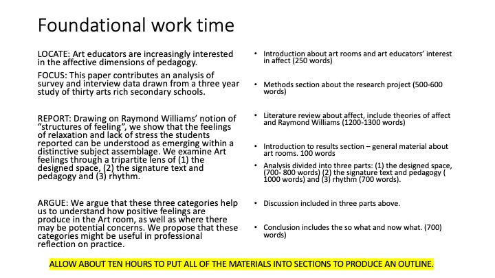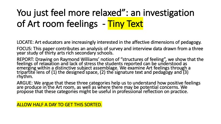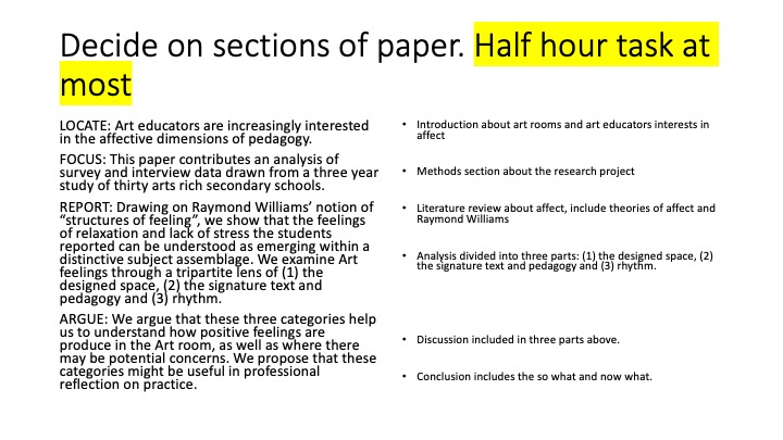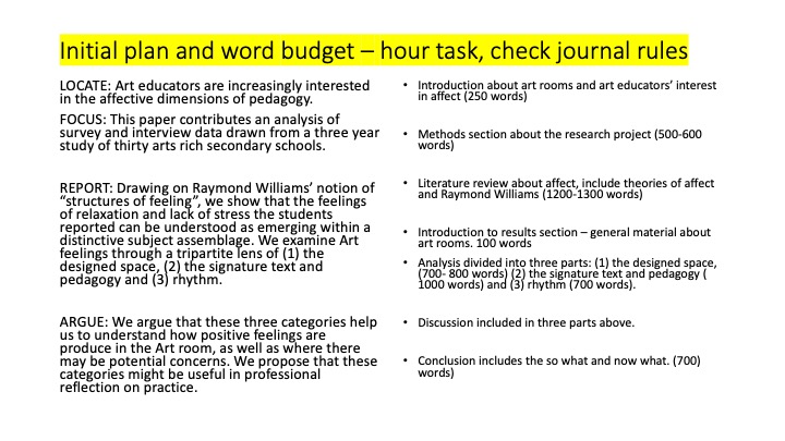 Below you can see a planning sequence where I go from a Tiny Text to dividing the paper into sections to allocating a notional word budget. I’ve shown this set of slides before but now I have added time allocations to them.