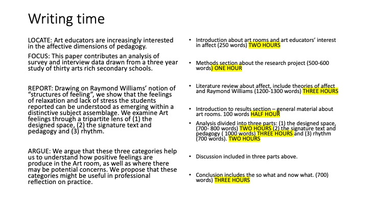 I have experience I can use in planning. But I still don’t always get it right. But. Yes, but. If you’re a relatively new academic writer then you don’t have experience. Yet. But you will have. Each time you write, you build up understandings about your own writing, how you work with various bits of text, what you struggle with, what often takes longer to get right. And you develop an idea of how long you might take for different aspects of writing.