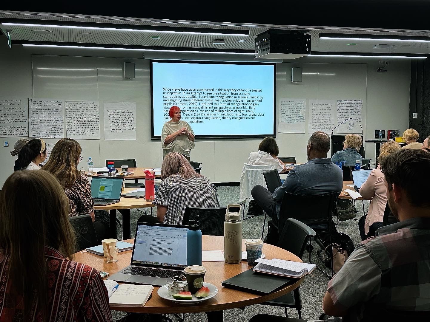 This skim reading exercise is designed to do three things at once – to offer a way to get the gist of a paper quickly, to engage with content that is relevant to participants’ doctoral experiences and then to synthesise the three papers and to find an angle on them. As is usual, different table groups in this workshop saw different ways to bring the papers together, and that is a fourth ‘lesson’ – there are often multiple possibilities for bringing literatures into conversation.